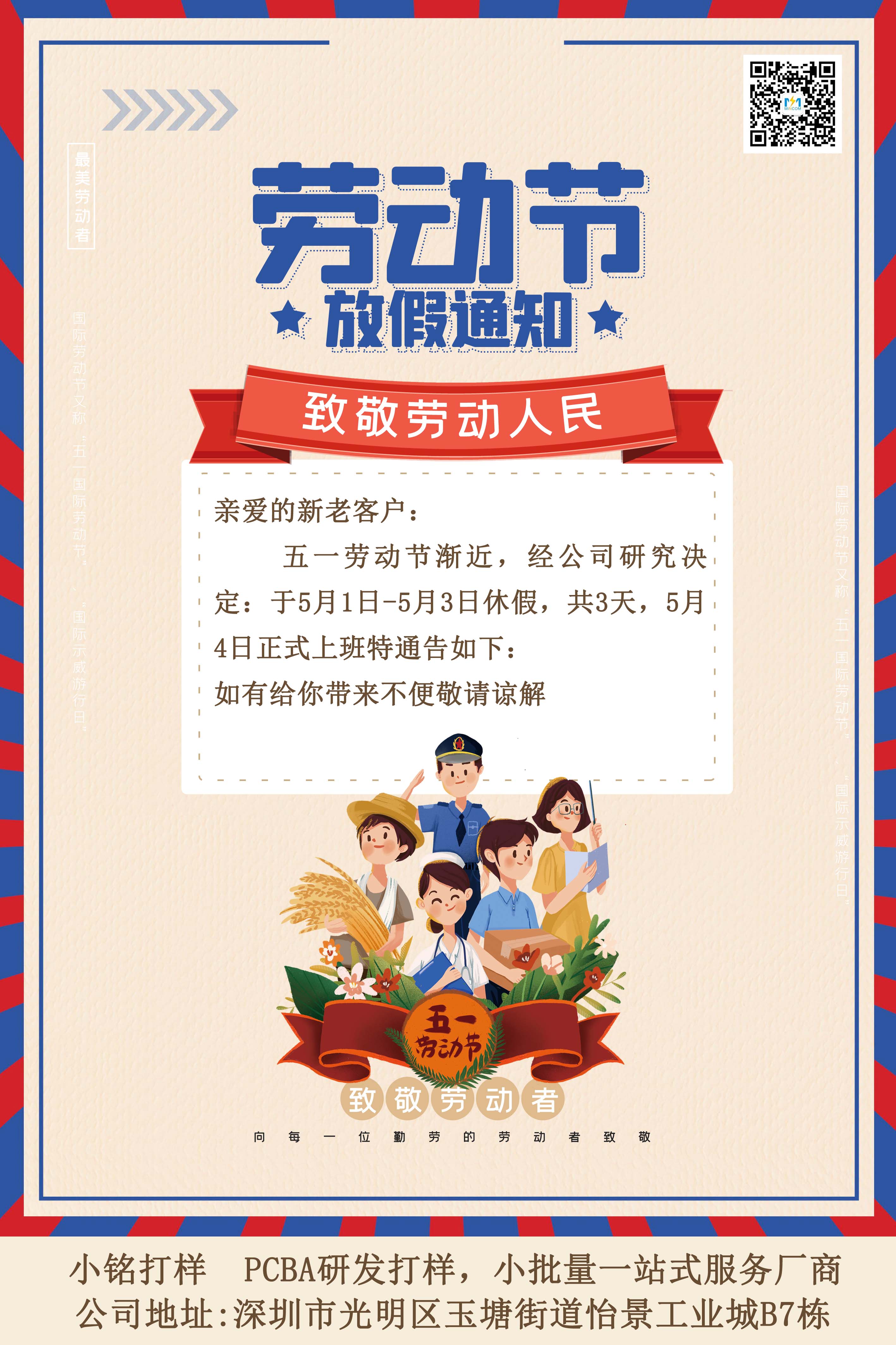 小銘打樣PCBA 五一放假通知,親愛的新老客戶: 五一勞動節漸近,經公司研究決定:于5月1日-5月3日休假,共3天,5月4日正式上班; 特此通告: 如有不便 敬請諒解!