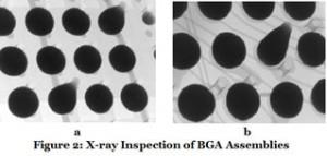 另一個非常常見的問題是BGA連接的“爆米花”。 當BGA的變形增加時,它會導致某些焊球在焊接過程中合并在一起,從而導致組件的“爆裂”,如圖3所示。當X射線檢測完成時,這很容易找到。 這里需要注意的是,這種影響可能不容易通過光學檢查來檢查,因為連接的爆裂可能在包裝的中心并因此從側面看不見。 因此,X射線檢測為BGA裝配工藝增添了非常有價值的優勢。