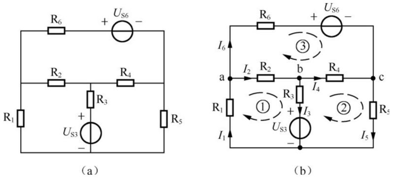 支路電流法是在計(jì)算復(fù)雜電路的各種方法中的一種最基本的方法。它通過應(yīng)用基爾霍夫電流定律和電壓定律分別對(duì)結(jié)點(diǎn)和回路列出所需要的方程組,而后解出各未知支路電流 支路分析法是基本的電路方程法,有支路電流法和支路電壓法,本節(jié)僅介紹支路電流法。 支路電流法是以電路中各支路電流為獨(dú)立變量,應(yīng)用KVL和KCL以及元件的VCR列出 電路的方程組求解獨(dú)立變量的方法。應(yīng)用支路電流法分析計(jì)算電路的一般步驟如 下。 (1)選擇各支路電流的參考方向。 (2)選定n?1個(gè)獨(dú)立結(jié)點(diǎn),列寫其KCL方程。 (3)選定b?(n?1)個(gè)回路,標(biāo)出回路的繞行方向,列寫KVL方程。 (4)聯(lián)立求解上述方程,得到b個(gè)支路電流。 (5)求解其他待求量。 例4.1 應(yīng)用支路電流法列寫圖4-1(a)所示電路的方程。圖4-1 例4.1圖